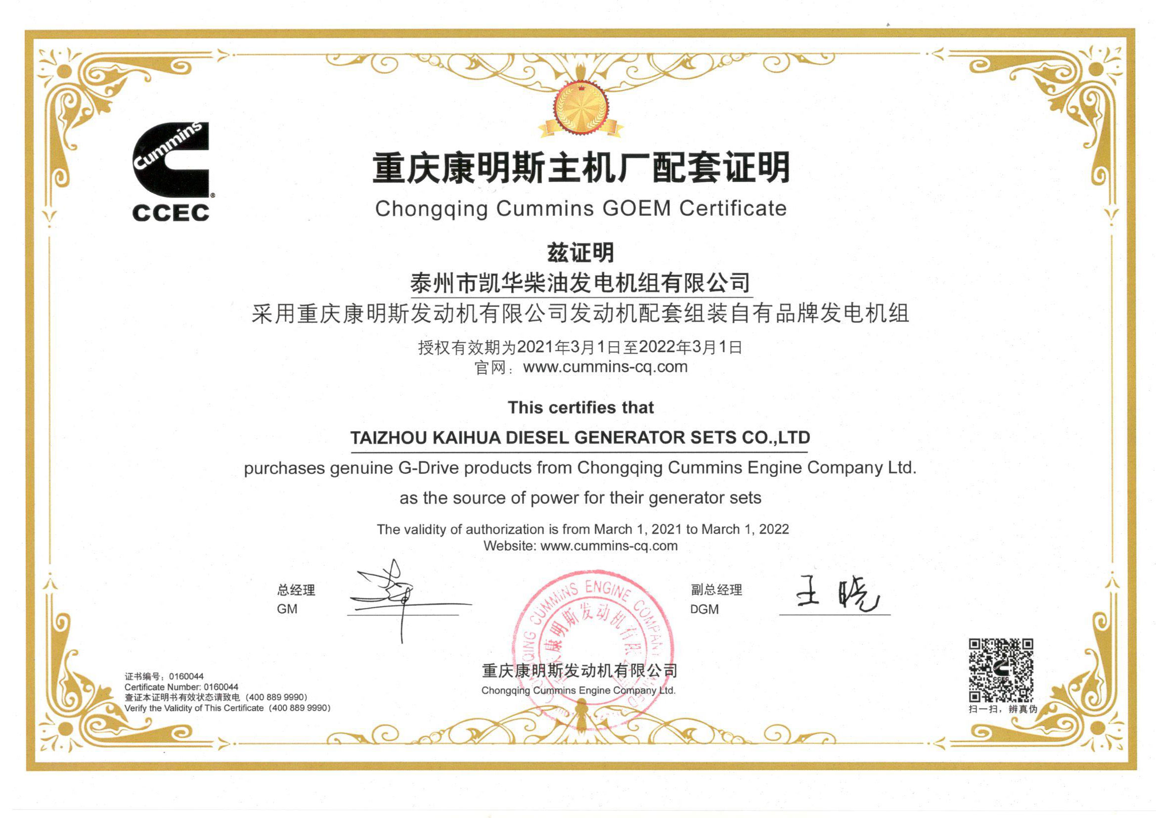 發(fā)電機(jī)組廠家凱華公司已先后通過ISO9001質(zhì)量認(rèn)證、泰爾認(rèn)證、ISO14001-2001環(huán)境管理體系認(rèn)證、GB/T28001-2001職業(yè)健康安全管理體系認(rèn)證,歐盟CE認(rèn)證、SGS認(rèn)證等。